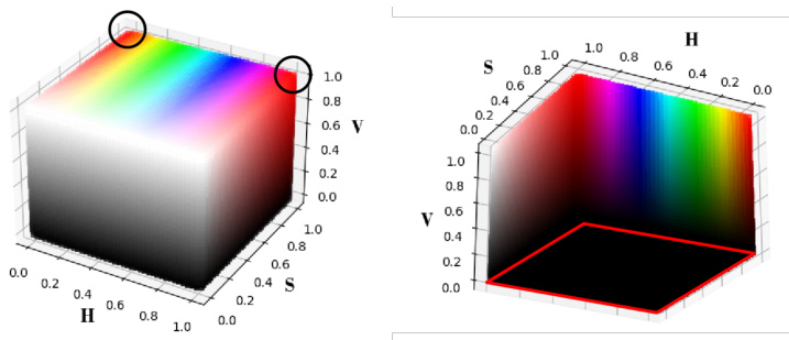 图 2: HSV色彩空间可视化。左图中的两个黑色圆圈表示沿色调轴的不连续颜色位置,而右图中的红色框显示了一个纯黑色平面,其亮度值 $=0$。