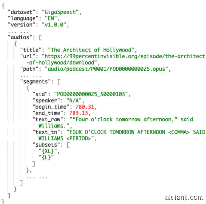我们将所有元数据信息保存到一个名为GigaSpeech.json的JSON文件中。图1: 展示了该文件的片段。为了便于本文展示,我们跳过了片段中许多非关键条目,例如"format"、"md5"、"source"等。