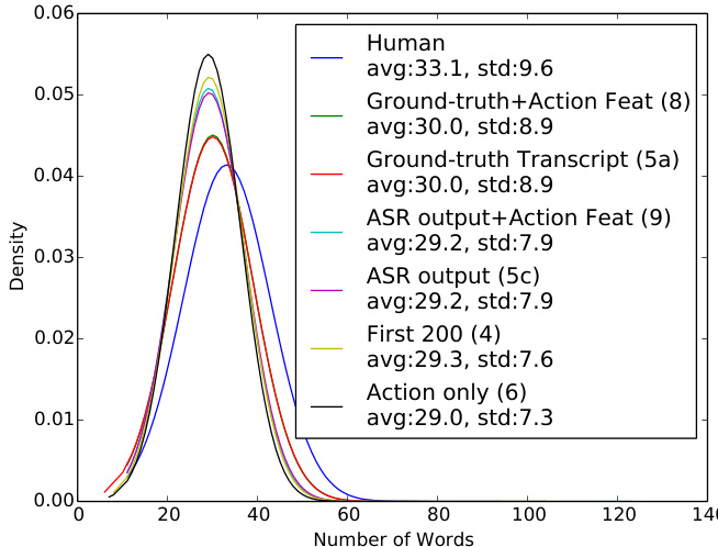 In Figure 3, we analyze the word distributions of different system generated summaries with the human annotated reference. The density curves show that most model outputs are shorter than human annotations with the action-only model (6) being the shortest as expected. Interestingly, the two different uni-modal and multimodal systems with groundtruth text and ASR output text features are very similar in length showing that the improvements in Rouge-L and Content-F1 scores stem from the difference in content rather than length. Example presented in Table A2 Section A.3 shows how the outputs vary.