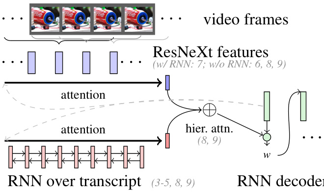我们研究了多种摘要生成模型。首先,我们采用基于循环神经网络(RNN)的序列到序列(S2S)模型(Sutskever等人,2014),该模型包含一个带注意力机制(Bahdanau等人,2014)的编码器RNN用于编码(文本或视频特征),以及一个解码器RNN用于生成摘要。我们的第二个模型是指针生成器(PG)模型(Vinyals等人,2015;Gülçehre等人,2016),该模型在抽象摘要任务(Nallapati等人,2016;See等人,2017)中表现出色。作为第三个模型,我们采用Libovický和Helcl 2017提出的层级注意力方法(原用于多模态机器翻译),通过结合文本和视觉模态来生成文本。该模型首先为每个输入模态(文本和视频)独立计算上下文向量,随后将这些上下文向量视为另一个编码器的状态并计算新向量。当使用动作特征序列而非单一平均向量表示视频时,RNN层有助于捕获上下文信息。图2展示了我们模型的核心构建模块。