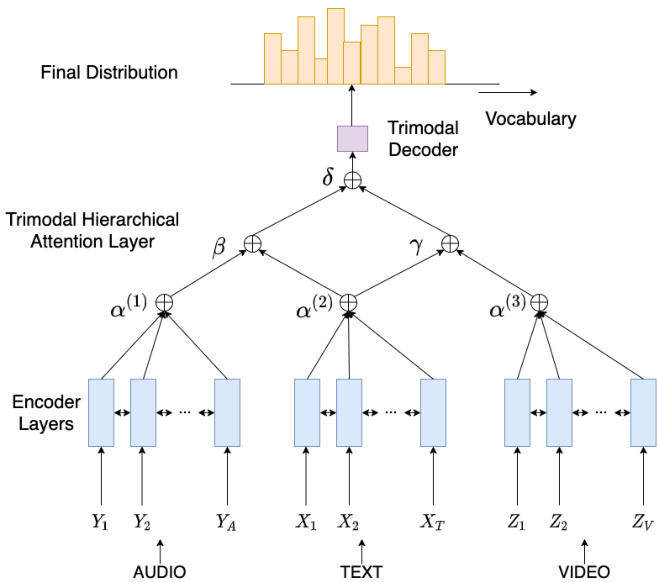Figure 1: Multimodal Abstract ive Sum mari z ation with Trimodal Hierarchical Attention (MAST) architecture: MAST is a sequence to sequence model that uses information from all three modalities – audio, text and video. The modality information is encoded using Modality Encoders, followed by a Trimodal Hierarchical Attention Layer, which combines this information using a three-level hierarchical attention approach. It attends to two pairs of modalities $(\delta)$ (Audio-Text and VideoText) followed by the modality in each pair ( $\beta$ and $\gamma$ ), followed by the individual features within each modality $(\alpha)$ . The decoder utilizes this combination of modalities to generate the output over the vocabulary.