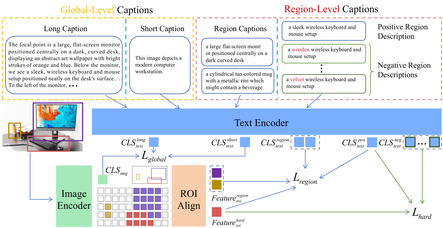 Global Contrastive Learning. Global contrastive learning aims to enhance the model’s fine-grained understanding by introducing a method of augmenting long caption alignment utilizing Large Multimodal Models (LMMs). This approach generates additional long captions that provide richer context and finer-grained descriptions. The inclusion of long captions enables the model to perceive and align with global-level semantic details, thereby enhancing fine-grained understanding and context awareness. In addition, we retain the alignment of short caption-image pairs. The long captions complement these short captions, ensuring that the model learns from both detailed, nuanced long captions for complex semantic information and concise, direct short captions for basic concepts. This dual approach improves the model’s overall performance in capturing a broader spectrum of visual information.