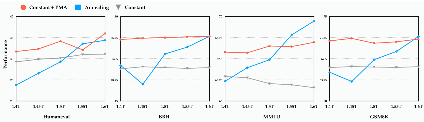 These findings raised a question: could we simplify the training process by using only the Warmup-Stable phases alongside PMA, skipping the decay phase, and avoiding learning rate adjustments? To investigate, we forked two training runs from the stable phase of Seed-MoE-1.3B/13B at 1.4T tokens. One continued with a constant learning rate, while another underwent annealing, each training for an additional 250B tokens. We then merged the models trained with the constant learning rate. As shown in Figure 3, early in training, the merged models significantly outperformed both the constant learning rate and annealed models. Even later, their performance was comparable to the annealed models.