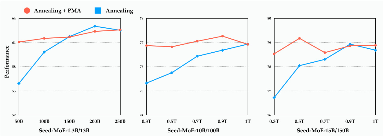 Next, we performed model merging in the cosine annealing phase by collecting weights from the annealing stages of Seed-MoE-1.3B/13B, Seed-MoE-10B/100B, and Seed-MoE-15B/150B. As depicted in Figure 2, as the learning rate gradually decreased, the models converged steadily, with performance continuing to improve. Interestingly, at the early annealing stage, the results of PMA were comparable to those at the end of the annealing process. In some cases, particularly for larger models, the merged models even surpassed those naturally annealed.
