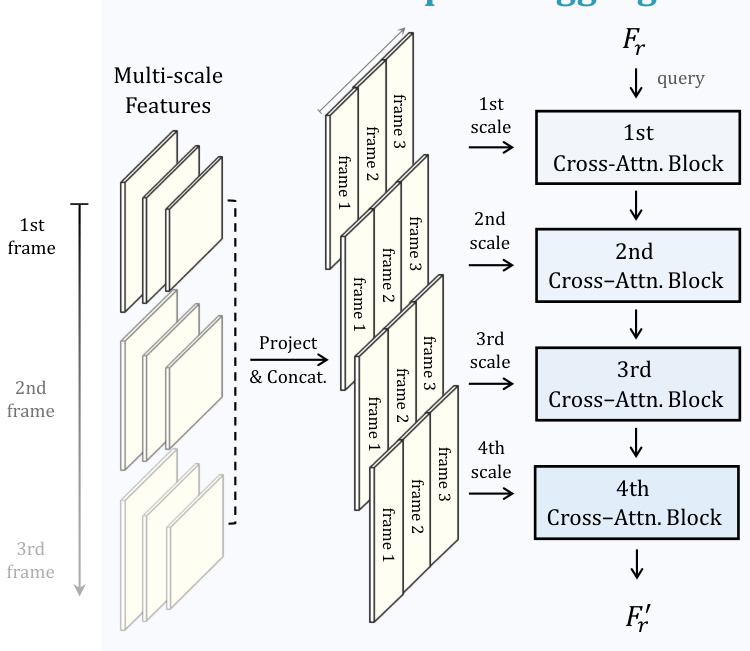where $2\leq i\leq5$ , $1\leq j\leq T,$ $F_{v j}^{i}$ represents the projected $j^{t h}$ frame features of $i^{t h}$ scale, and ${F_{v}^{i}}_{i=2}^{5}$ is the final transformed multi-scale visual feature. Then, the resulting multi-modal temporal features are regarded as the key and value in the following cross-attention blocks.