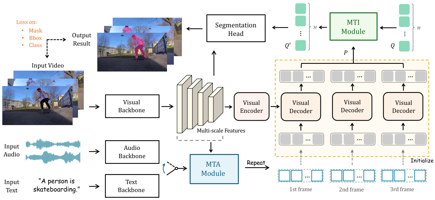 多模态视频目标分割(VOS)存在两大核心挑战。首先,该方法不仅需要挖掘视频中丰富的时空一致性,还需对齐图像、语言和音频之间的多模态语义。现有研究主要关注独立帧内的视觉-语言或视觉-音频模态融合,仅通过跨模态注意力机制(Chen et al. 2019; Hu et al. 2020; Shi et al. 2018)或动态卷积(Margffoy-Tuay et al. 2018)进行特征交互。这种做法忽略了跨帧的多模态时序信息,而该信息对于视频中目标的一致分割与跟踪至关重要。其次,针对语言和音频两种模态的给定参考,现有工作采用不同的架构设计和训练策略来分别处理其模态特性。因此,如何构建强大且统一的多模态VOS框架仍是待解难题。