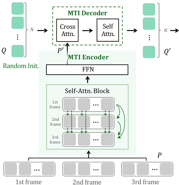 图 3: 多目标时序交互。我们引入MTI模块实现帧间对象级交互,并维护一组视频级查询表征以实现跨帧目标关联。