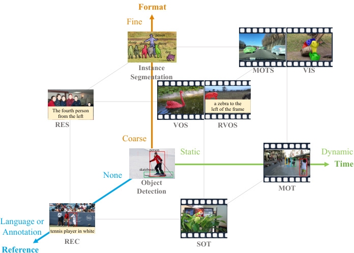 videos, Multiple Object Tracking (MOT) [3, 78, 130, 133], Multi-Object Tracking and Segmentation (MOTS) [50, 98, 113], and Video Instance Segmentation (VIS) [46,105, 108, 117] require finding all object trajectories of specific categories in videos. Except for category names, some tasks provide other reference information. For example, Referring Expression Comprehension (REC) [120,126,135], Referring Expression Segmentation (RES) [121,124,126], and Referring Video Object Segmentation (R-VOS) [7, 91, 109] aim at finding objects matched with the given language expressions like “The fourth person from the left”. Besides, Single Object Tracking (SOT) [5, 54, 111] and Video Object Segmentation (VOS) [19, 82, 112] take the target annotations (boxes or masks) given in the first frame as the reference, requiring to predict the trajectories of the tracked objects in the subsequent frames. Since all the above tasks aim to perceive instances of certain properties, we refer to them collectively as instance perception.