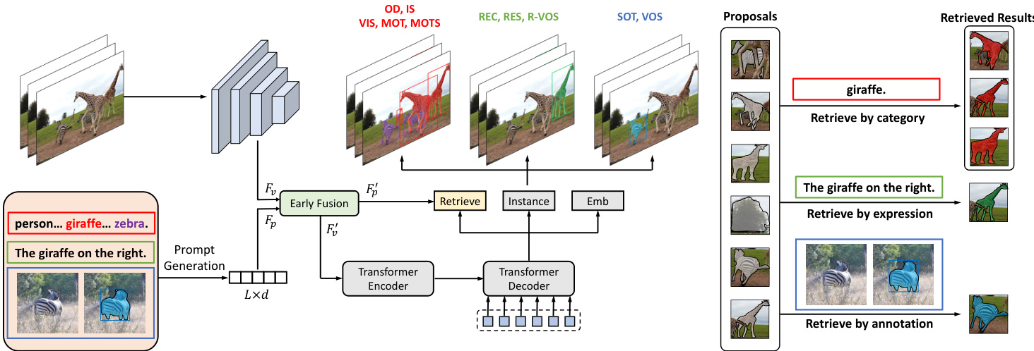 To answer this question, we propose UNINEXT, a universal instance perception model of the next generation. We first reorganize 10 instance perception tasks into three types according to the different input prompts: (1) category names as prompts (Object Detection, Instance Segmentation, VIS, MOT, MOTS). (2) language expressions as prompts (REC, RES, R-VOS). (3) reference annotations as prompts (SOT, VOS). Then we propose a unified prompt-guided object discovery and retrieval formulation to solve all the above tasks. Specifically, UNINEXT first discovers $N$ object proposals under the guidance of the prompts, then retrieves the final instances from the proposals according to the instance-prompt matching scores. Based on this new formulation, UNINEXT can flexibly perceive different instances by simply changing the input prompts. To deal with different prompt modalities, we adopt a prompt generation module, which consists of a reference text encoder and a reference visual encoder. Then an early fusion module is used to enhance the raw visual features of the current image and the prompt embeddings. This operation enables deep information exchange and provides highly disc rim i native representations for the later instance prediction step. Considering the flexible query-toinstance fashion, we choose a Transformer-based object detector [136] as the instance decoder. Specifically, the decoder first generates $N$ instance proposals, then the prompt is used to retrieve matched objects from these proposals. This flexible retrieval mechanism overcomes the disadvantages of traditional fixed-size class if i ers and enables joint training on data from different tasks and domains.