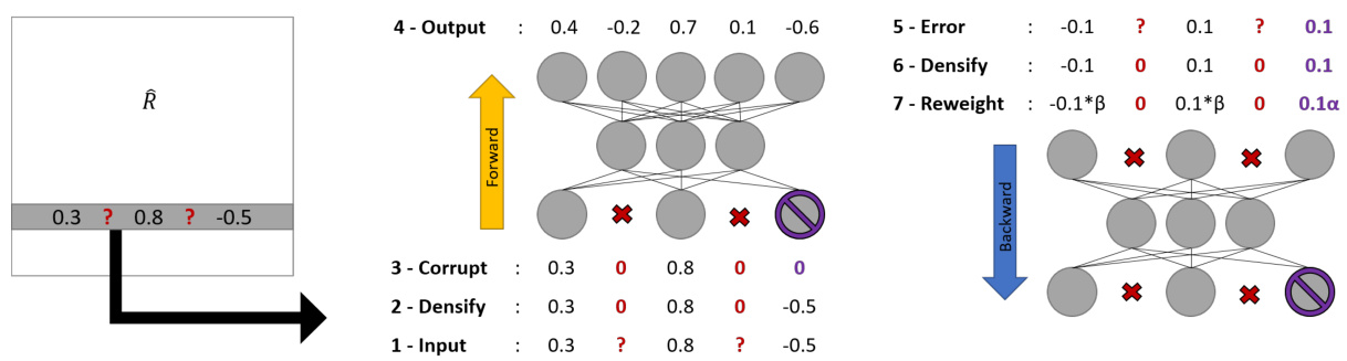 Figure 1: Training steps for auto encoders with incomplete data. The input is drawn from the matrix of ratings, unknown values are turned to zero, some ratings are masked (corruption) and a dense estimate is obtained. Before back propagation, unknown ratings are turned to zero error, prediction errors are reweighted by  $\alpha$   and reconstruction errors are reweighted by  $\beta$  .