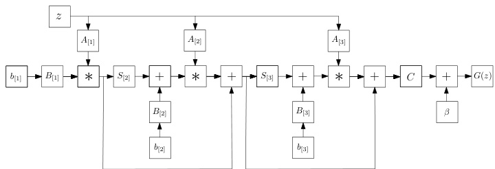 \pmb{x}{n}=\left(\pmb{A}{[n]}^{T}\pmb{z}\right)*\left(\pmb{S}{[n]}^{T}\pmb{x}{n-1}+\pmb{B}{[n]}^{T}\pmb{b}_{[n]}\right)