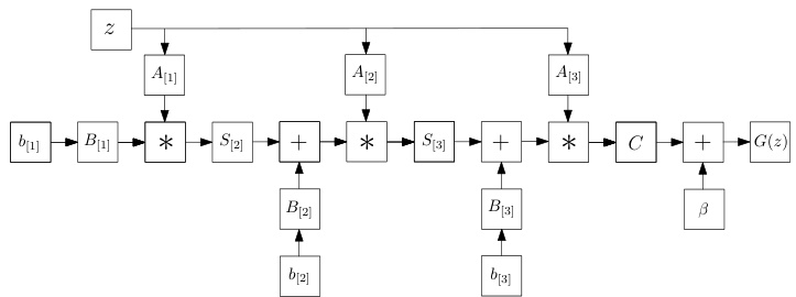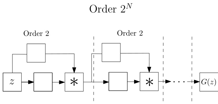 Figure 5: Abstract illustration of the ProdPoly. The input variable  $_{z}$   on the left is the input to a  $2^{n d}$   order expansion; the output of this is used as the input for the next polynomial (also with a  $2^{n d}$  order expansion) and so on. If we use   $N$   such polynomials, the final output  $G(z)$   expresses a  $2^{N}$   order expansion. In addition to the high order of approximation, the benefit of using the product of polynomials is that the model is flexible, in the sense that each polynomial can be implemented as a different decomposition of Sec. 3.1.