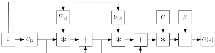 for $n=2,\ldots,N$ with $x_{1}=U_{[1]}^{T}z$ and ${\pmb x}={\pmb C}{\pmb x}{N}+\beta$ The parameters $C\in\mathbb{R}^{o\times k},\pmb{U}_{[n]}\bar{\in\mathbb{R}}^{d\times k}$ for $n=1,\ldots,N$ are learnable. To avoid overloading the diagram, a schematic assuming a third order expansion $N=3,$ ) is illustrated in Fig. 2.