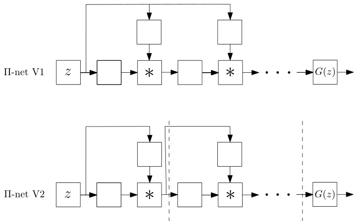 图 1: 本文介绍了一类称为$\Pi-$网络的结构,其输出是输入的多项式。此处的输入$_{z}$可以是生成式对抗网络(Generative Adversarial Network)在生成任务中的隐空间,也可以是判别任务中的图像。我们的多项式网络可通过一种特殊的跳跃连接(skip connections)轻松实现。