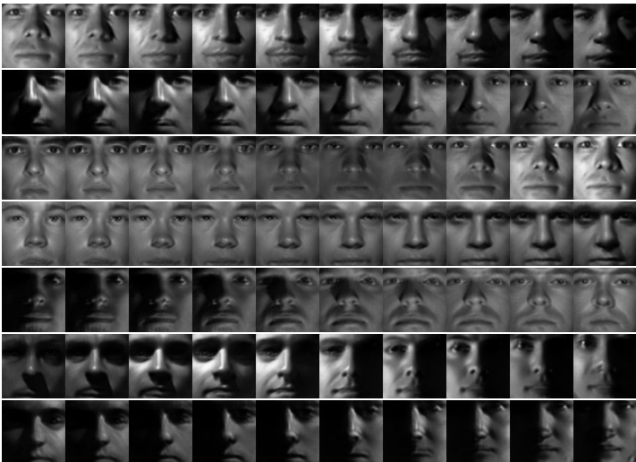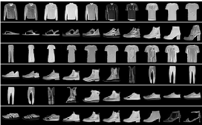 Two experiments are conducted with a polynomial generator (Fashion-Mnist and YaleB). We perform a linear inter pol ation in the latent space when trained with FashionMnist [64] and with YaleB [10] and visualize the results in Figs. 6, 7, respectively. Note that the linear interpolation generates plausible images and navigates among different categories, e.g. trousers to sneakers or trousers to t-shirts. Equivalently, it can linearly traverse the latent space from a fully illuminated to a partly dark face.