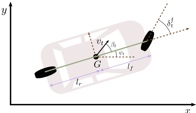 Fig. 2: [19] The kinematic bicycle model. $G$ is the geometric center of the vehicle and $v_{t}$ is its instantaneous velocity. Since our dataset does not contain entries for $\delta_{t}^{f}$ , we regard $\beta_{t}$ as steering directly, which is mathematically equivalent to setting $l_{f}=0$ . We fit $l_{r}$ by grid search for each recorded vehicle trajectory.