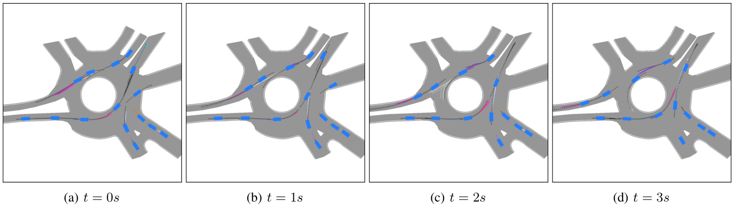 Fig. 4: A sequence of 4 subsequent prediction snapshots spaced 1 second apart. For each vehicle in the scene we show 10 sampled predictions over the subsequent 3 seconds based on the previous 1 second. Notice the car that just entered the roundabout from top-right in 4a, for which ITRA predicts that it will go forward in the roundabout, and as it enters the roundabout in $_{\mathrm{4c}}$ , the prediction diversifies to include both exiting the roundabout and continuing the turn, finally matching the ground truth trajectory (in dark grey) in 4d once the car started turning.