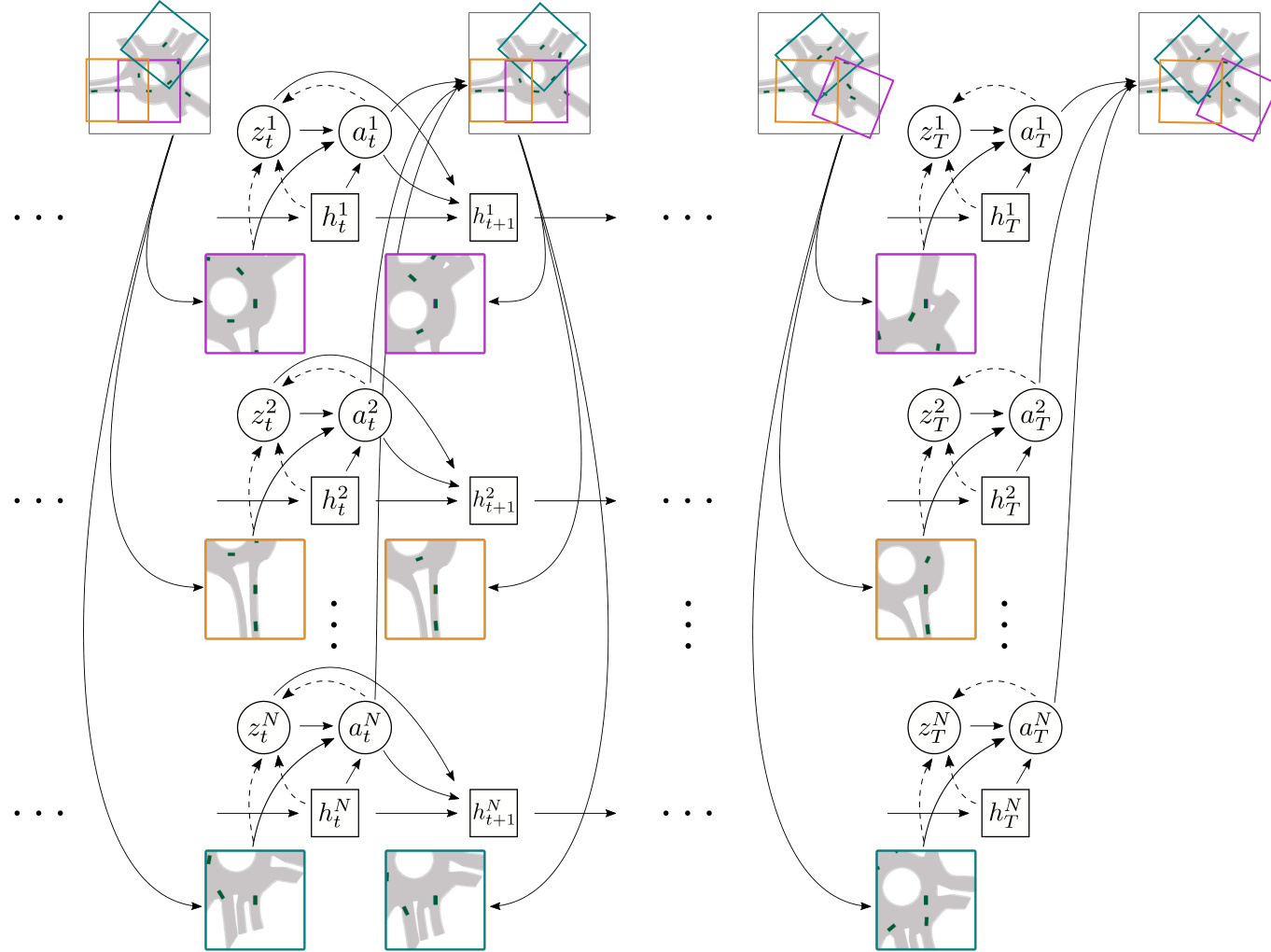 我们模型中的每个智能体都是一个独立的条件变分循环神经网络 (CVRNN),各智能体间共享网络参数。该网络以模拟器提供的鸟瞰图像作为输入,输出一个动作反馈给模拟器。我们采用简单成熟的卷积和循环神经网络架构,完全通过最大似然法进行训练,并运用变分推断工具 [14][15]。如图 1 所示,我们无需依赖任何临时特征工程、针对特定问题的神经架构或多样性诱导损失函数,仍能实现最先进的性能表现和真实的多模态预测。
