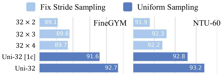 Uniform Sampling. The input sampled from a small temporal window may not capture the entire dynamic of the human action. To validate this, we conduct experiments on FineGYM and NTU-60. For fixed stride sampling, which samples from a fixed temporal window, we try to sample 32 frames with the temporal stride 2, 3, 4; for uniform sampling, we sample 32 frames uniformly from the entire clip. In testing, we adopt a fixed random seed when sampling frames from each clip to make sure the test results are reproducible. From Figure 3, we see that uniform sampling consistently outperforms sampling with fixed temporal strides. With uniform sampling, 1-clip testing can even achieve better results than fixed stride sampling with 10-clip testing. Note that the video length can vary a lot in NTU-60 and FineGYM. In a more detailed analysis, we find that uniform sampling mainly improves the recognition performance for longer videos in the dataset (Figure 4). Besides, uniform sampling also outperforms fixed stride sampling on RGBbased recognition on the two datasets6.