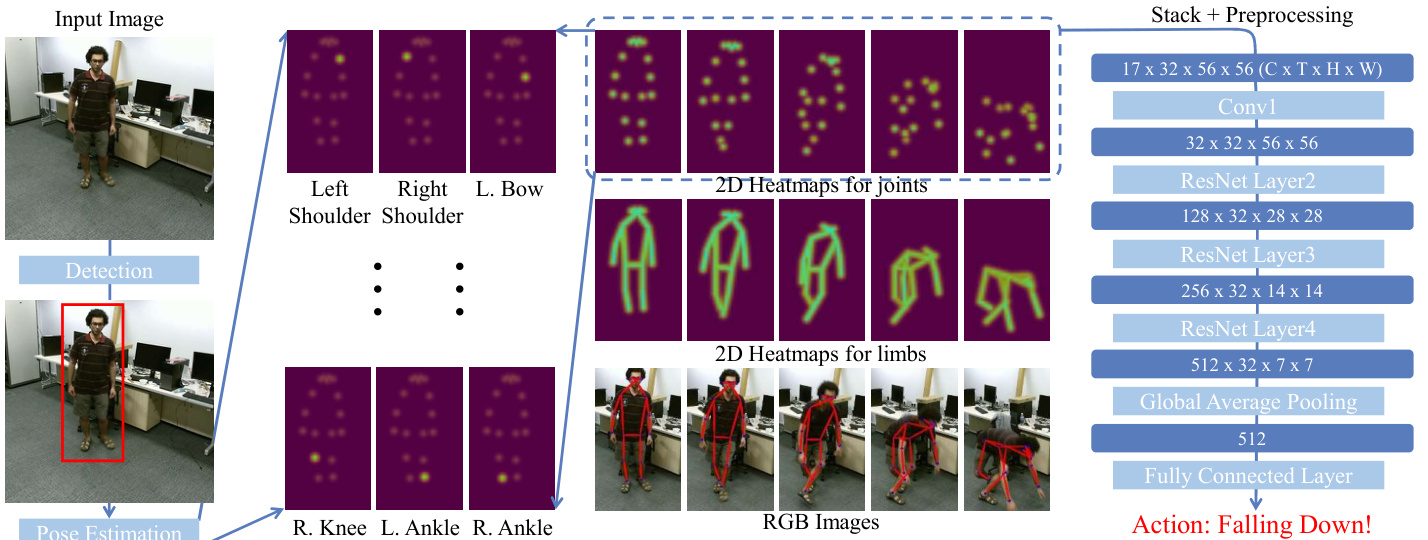 Figure 2. Our Framework. For each frame in a video, we first use a two-stage pose estimator (detection $^+$ pose estimation) for 2D human pose extraction. Then we stack heatmaps of joints or limbs along the temporal dimension and apply pre-processing to the generated 3D heatmap volumes. Finally, we use a 3D-CNN to classify the 3D heatmap volumes.