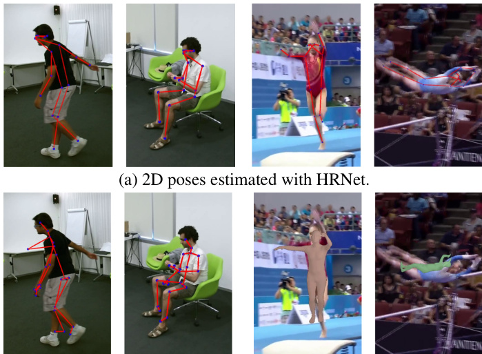 图 1: PoseConv3D以2D姿态作为输入。通常情况下,2D姿态的质量优于3D姿态。我们使用HRNet对NTU-60和FineGYM视频中的2D姿态进行可视化展示 (a)。显然,其质量远高于通过传感器采集的3D姿态 (b) 或采用最先进估计算法生成的3D姿态 (c)。