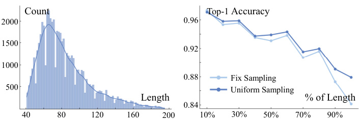 图 4: 均匀采样有助于建模更长视频。左: NTU60-XSub验证集视频长度分布。右: 均匀采样提高了较长视频的识别准确率。