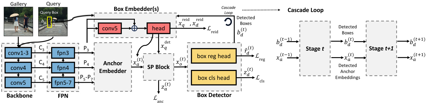 A diagram detailing components of SPNet and the Cascade Loop sub component is shown in Fig. 3. SPNet takes Gallery images as input, and outputs detected boxes $b_{d}$ with corresponding class logits $z_{d}$ and re-id embeddings $x_{d}^{\mathrm{reid}}$ . SPNet also takes a Query scene as input with a corresponding ground truth person box $b_{q}$ , and outputs the re-id embedding for that box $x_{q}^{\mathrm{reid}}$ . The query re-id embedding $x_{q}^{\mathrm{reid}}$ is compared to gallery re-id embeddings $x_{d}^{\mathrm{reid}}$ via cosine similarity to produce re-id scores, which are used to rank predictions for retrieval. Image features $\left(\mathbf{C}{3}{-}\mathbf{C}{5}\right)$ are learned by the backbone and refined by the FPN $(\mathrm{{P}{3}{-}\mathrm{{C}{7})}}$ , and then fed to the Box Embedder, with either query boxes $b_{q}$ or detected boxes $b_{d}$ , to learn re-id embeddings $x^{\mathrm{reid}},x^{\mathrm{det}}$ . FPN features are also fed to the Anchor Embedder to learn initial anchor embeddings ${\boldsymbol{{x}}}_{a}^{0}$ .