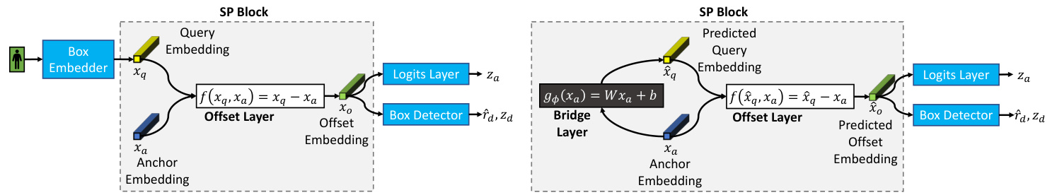 Box Prediction. Both pathways output offset embeddings $x_{o}$ that are passed to a separate Box Detector module, shown in Fig. 3, which performs the box refinement. The box reg head is a 4-layer MLP with input $x_{o}$ which predicts offsets $\hat{r}{d}$ between anchor boxes and matching ground truth boxes. The box cls head uses the same Logits Layer as the SP Block to produce class logits $z_{d}$ . Predicted boxes $b_{d}$ are fed back to the Box Embedder, the same as that used to produce $\boldsymbol{x}{q}^{\mathrm{reid}}$ , to produce predicted reid embeddings $x_{d}^{\mathrm{reid}}$ . The $x_{q}^{\mathrm{reid}}$ from queries are compared to xrdeid from gallery images for ranking.