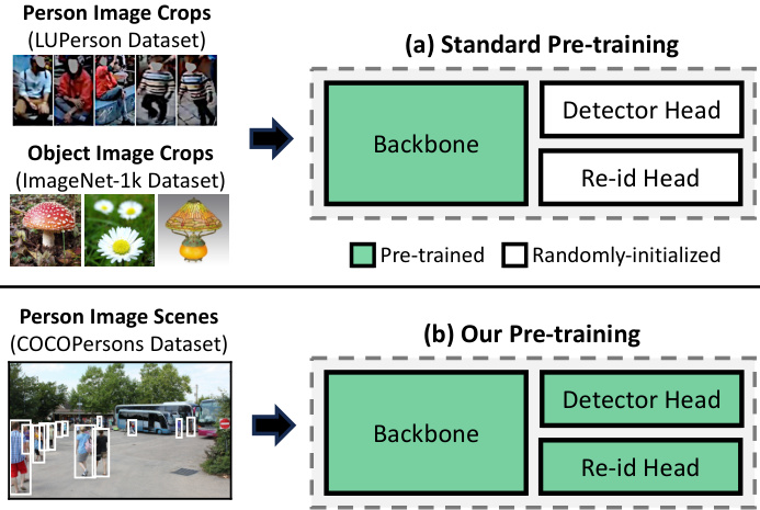 图 2: 标准行人搜索模型预训练方法 (上图所示) 仅使用 ImageNet-1k 分类或来自 LUPerson 等数据集的裁剪行人图像预训练骨干网络权重。我们的方法 (下图所示) 使用包含多个标注行人的完整场景图像初始化全部模型权重。(LUPerson 图像来自论文 [13])
