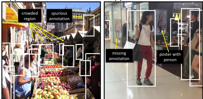 (a) Label Noise in Coco Persons (b) Label Noise in CUHK-SYSU Figure 1. Examples of label noise and annotation challenges in real annotated scenes, with white boxes used for annotations.