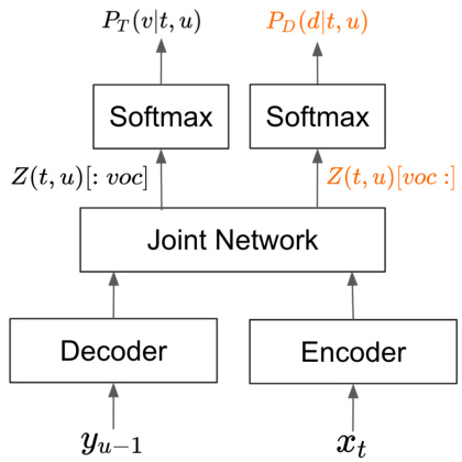 Figure 2. Architecture of a TDT model, which contains an encoder, a decoder, and a joint network. The TDT joint network emits two sets of output, one for the output token $Z(t,u)[:\mathrm{voc}]$ , and the other for the duration of the token $Z(t,u)[\operatorname{voc}[$ . The two distributions are jointly trained during model training.