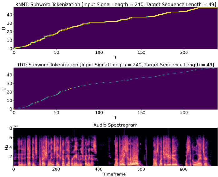 图 1: 从上至下分别为:传统RNNT生成的对齐结果、配置为[0-8]的TDT模型生成的对齐结果,以及对应的频谱图。由于子采样处理,对齐结果中$T$轴的每个单位对应频谱图中的4帧。值得注意的是,TDT模型学会了跳帧机制。在语音活跃的音频段中较少出现长跳帧,但在音频中4段相对静默的片段(传统RNNT对齐结果呈现为水平线)中,TDT模型采用长持续时间跳过了大部分帧。