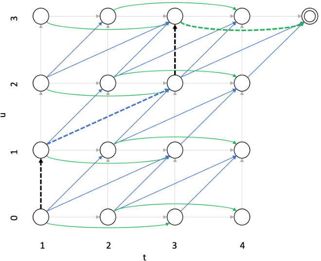 图 3: 支持时长 $^{{0,1,2}}$ 的TDT模型输出概率网格。我们遵循 (Graves, 2012) 的惯例,令 $t$ 从1开始,$u$ 从0开始。节点 $(t,u)$ 表示在前 $t$ 帧观测到前 $u$ 个输出标签的概率。虚线箭头构成网格中的完整路径。