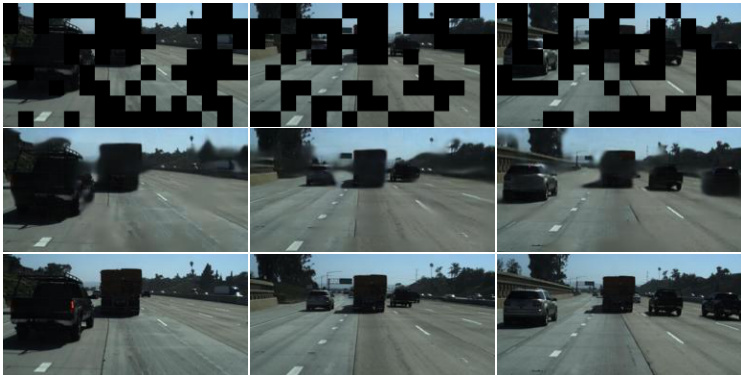 Fig. 4. Visualization of the reconstructing results in the pretraining phase. The first row shows images with $50%$ of the patches masked. The second row shows the reconstructed images after pre-training. The third row shows the original images.