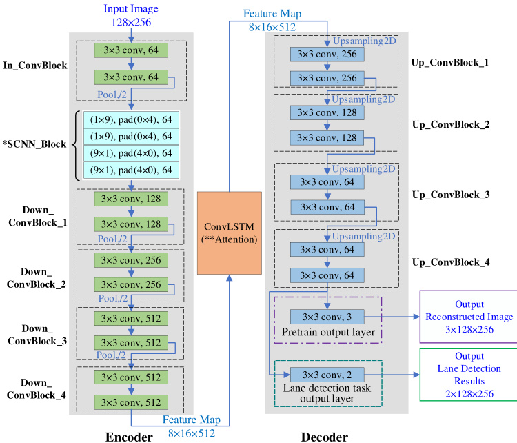 Fig. 2. Pre-training network and lane line detection neural network structure. *SCNN block is for S CNN U Net Con vL STM and S CNN U Net Attention, U Net Con vL STM does not have it. **Attention block is only for S CNN U Net Attention model.