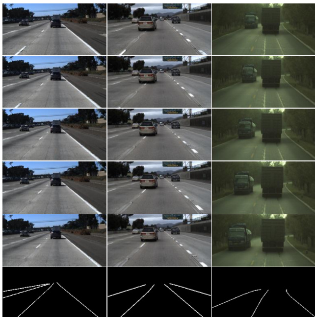Fig. 3. Image samples in the tvtLANE training set and the test set. The first five images in each column are the inputs of consecutive frames, and the sixth one is the labeled ground truth of the last image in the consecutive frames. The first column is one sample in the training set, the second column is for the test set #1 (normal), and the third column is for test set #2 (challenging).