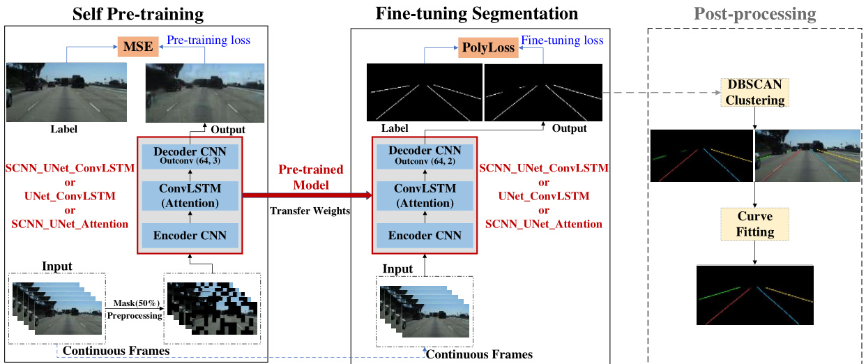 This study proposes a pipeline for lane detection through self pre-training with masked sequential auto encoders and finetuning segmentation with customized PolyLoss. In the first stage, the images are randomly masked as the inputs, and the neural network model is pre-trained with reconstructing the complete images as the objective. In the second stage, the pretrained neural network model weights are transferred to the segmentation neural network model with the same backbone and only the structure of the output layer is adjusted. In this phase, continuous image frames without any masking are served as inputs. The neural network weights are further updated and fine-tuned by minimizing PolyLoss with the back propagation mechanism. In this study, three neural network models, i.e., U Net Con vL STM [1], S CNN U Net Con vL STM [10], and S CNN U Net Attention [17] are tested. In the last stage, post-processing methods, e.g., Density-based spatial clustering of applications with noise (DBSCAN) [34] for clustering the lane types and curve fitting to smooth the detected lines, are proposed to further improve the overall performance of the detection. However, due to time constraints and computational restrictions and following the convention in literature, e.g., [1], [10], [11], post-processing is not specifically explored in this paper. The framework of the proposed pipeline is illustrated in Fig. 1. In the remaining parts of this section, each phase will be introduced in detail.