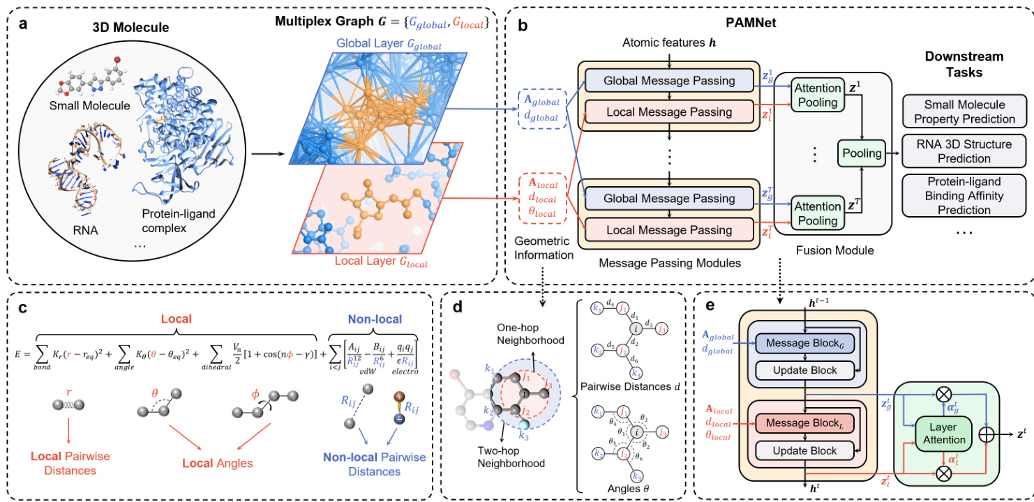 Figure 1. Overview of PAMNet. a, Based on the 3D structure of any molecule or molecular system, a two-layer multiplex graph  $G={G_{g l o b a l},G_{l o c a l}}$   is constructed to separate the modeling of global and local interactions. b, PAMNet takes  $G$   as input and learns node-level or graph-level representation for downstream tasks. PAMNet contains stacked message passing modules that update the node embeddings  $\mathbf{z}$   in  $G$  , and a fusion module that learns to combine the updated embeddings. In each message passing module, two message passing schemes are designed to encode the different geometric information in  $G$  ’s two layers. In the fusion module, a two-step pooling process is proposed. c, Calculation of molecular energy  $E$   in molecular mechanics. d, An example of the geometric information in  $G$  . By considering the one-hop neighbors  ${j}$   and two-hop neighbors  ${k}$   of atom  $i$  , we can define the pairwise distances  $d$   and the related angles θ . e, Detailed architecture of the message passing module and the attention pooling in PAMNet.