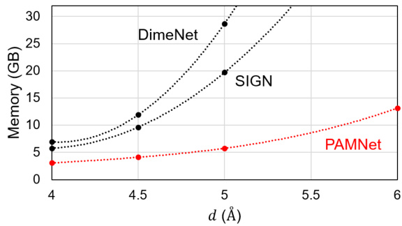 Figure 3. Memory consumption vs. the largest cutoff distance  $d$   on PDBbind. We compare PAMNet with the GNN baselines that also explicitly incorporate the 3D molecular geometric information like pairwise distances and angles.