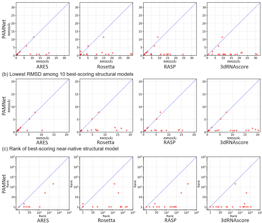 Figure 2. Performance comparison on RNA-Puzzles. Given a group of candidate structural models for each RNA, we rank the models using PAMNet and the other four leading scoring functions for comparison. Each cross in the figures corresponds to one RNA. (a) The best-scoring structural model of each RNA predicted by the scoring functions is compared. PAMNet in general identifies more accurate models (with lower RMSDs from the native structure) than those decided by the other scoring functions. (b) Comparison of the 10 best-scoring structural models. The identification s of PAMNet contain accurate models more frequently than those from other scoring functions. (c) The rank of the best-scoring near-native structural model for each RNA is used for comparison. PAMNet usually performs better than the other scoring functions by having a lower rank.