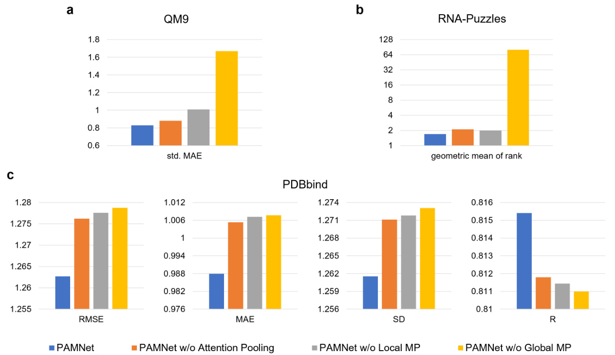 To figure out whether all of the components in PAMNet, including the fusion module and the message passing modules, contribute to the performance of PAMNet, we conduct an ablation study by designing PAMNet variants. Without the attention pooling, we use the averaged results from the message passing modules in each hidden layer to build a variant. We also remove either the Local Message Passing or the Global Message Passing for investigation. The performances of all PAMNet variants are evaluated on the three benchmarks. Specifically, the std. MAE across all properties on QM9, the geometric mean of the ranks across all RNAs on RNA-Puzzles, and the four metrics used in the experiment on PDBbind are computed for comparison. The results in Figure 4 show that all variants decrease the performance of PAMNet in the evaluations, which clearly validates the contributions of all those components. Detailed results of the properties on QM9 can be found in Supplementary Table S2.