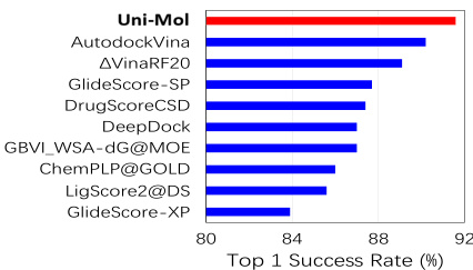 Results From the docking power benchmark results shown in Figure 3, Uni-Mol ranks the 1st, with the top 1 success rate of $91.6%$ . For comparison, the previous top scoring function AutoDock Vina [62, 63] achieves $90.2%$ of the top 1 success rate in this benchmark. From the binding pose accuracy results shown in Table 5, Uni-Mol also surpasses all other baselines. Notably, Uni-Mol outperforms the second best method by $22.81%$ under the threshold of $2 A$ . This result indicates that Uni-Mol can effectively learn the 3D information from both molecules and pockets, as well as the interaction in 3D space of them. Even without pre training, Uni-Mol (denoted as Uni-Molrandom) is also better than other baselines. This demonstrates the effectiveness of Uni-Mol backbone, as it effectively learns the 3D information by limited data.