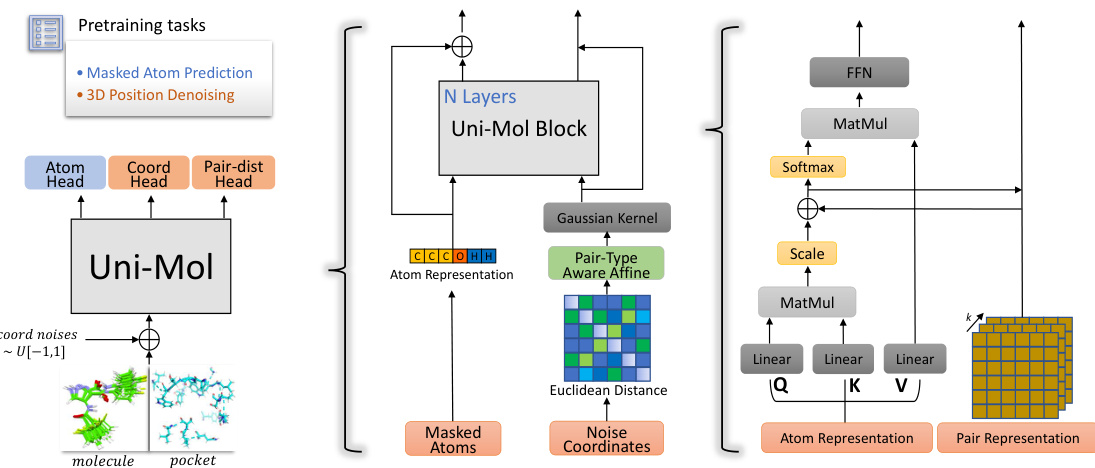 Self-supervised task is vitally important for effective learning from large-scale unlabeled data. For example, the masked token prediction task in BERT [4] encourages the model to learn the contextual information. Similar to BERT, the masked atom prediction task is used in Uni-Mol. For each molecule/pocket, we add a special atom [CLS], whose coordinate is the center of all atoms, to represent the whole molecule/pocket. However, as 3D spatial positional encoding leaks chemical bonds, atom types could be inferred easily, and therefore, the masked atom prediction cannot encourage the model to learn useful information. To tackle this, as well as learning from 3D information, we design a 3D position denoising task. Particularly, uniform noises of $[-1\overset{\circ}{\mathrm{A}},1\mathring{\mathrm{A}}]$ are added to the random $15%$ atom coordinates, then the spatial positional encoding is calculated based on corrupted coordinates. In this way, the masked atom prediction task becomes non-trivial. Besides, two additional heads are used to recover the correct spatial positions. 1) Pair-distance prediction. Based on pair-representation, the model needs to predict the correct Euclidean distances of the atoms pairs with corrupted coordinates. 2) Coordinate prediction. Based on SE(3)-E qui variance coordinate head, the model needs to predict the correct coordinates for the atoms with corrupted coordinates.