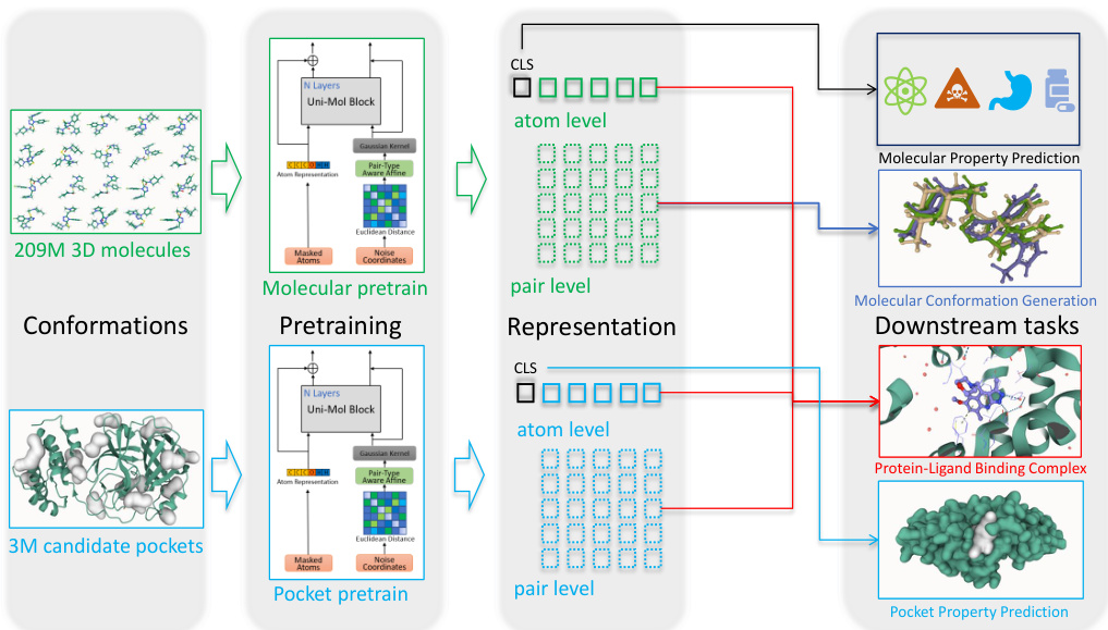 Figure 1: Schematic illustration of the Uni-Mol framework. Uni-Mol is composed of two models: a molecular pre training model trained by 209M molecular 3D conformations; a pocket pre training model trained by 3M candidate protein pocket data. The two models are used independently for separate tasks, and are combined when used in protein-ligand binding tasks.