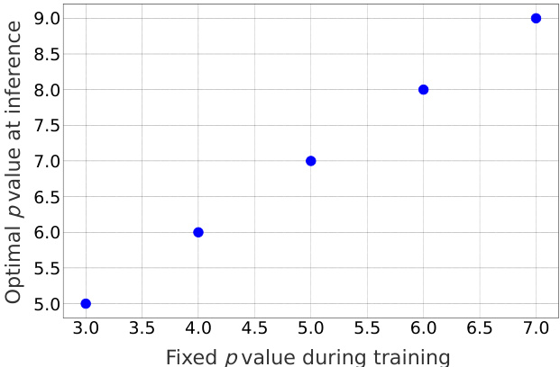图 3: 推理时的最优 $p$ 值 (y轴所示) 与DELG训练期间固定GeM池化 $p$ 值的对应关系。我们观察到,推理阶段的最优 $p$ 值始终大于训练时采用的固定 $p$ 值。