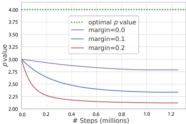 图 2: 不同ArcFace边界值下DELG训练过程中可训练的GeM池化参数$p$值变化,与最优$p$值(4.0)的对比。注意较大的边界值会导致$p$值进一步偏离最优值。