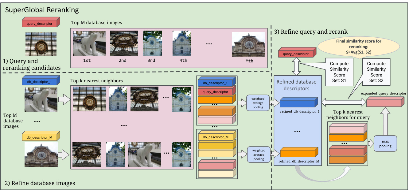Reranking is usually conducted on the top $\mathcal{M}$ retrieved database images, where $M$ is much smaller than the database size – making it feasible to apply feature refinement for each of these images on the fly, to then issue the updated query against the $M$ retrieved images with the updated representations. Inspired by QE and DBA, our Super Global reranking proposes a simple but effective method to aggregate information between the top-ranked images and the query, to update their image representations. Unlike previous QE/DBA work [14, 3] that generally focuses on improving the features for a better recall, our work aims to refine the features for higher precision, since the reranking is performed on the top $\mathcal{M}$ results only.
