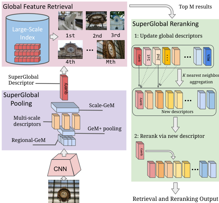 A recent trend in this area is on leveraging sophisticated matching processes at the reranking stage, e.g. transformers [40] or 4D correlation networks [23], which have led to remarkable improvements in the quality of retrieved results. However, this has come at a significant cost, where reranking latency takes several seconds per query and requires more than 1MB of memory per database image – making these approaches challenging to scale to large repositories. Our work directly tackles this limitation by proposing the first method fully based on global image features for both stages. In addition, we rethink pooling techniques and propose modules to improve global feature extraction. An overview of our method, Super Global, is presented in Figure 1. More specifically, we introduce the following contributions.