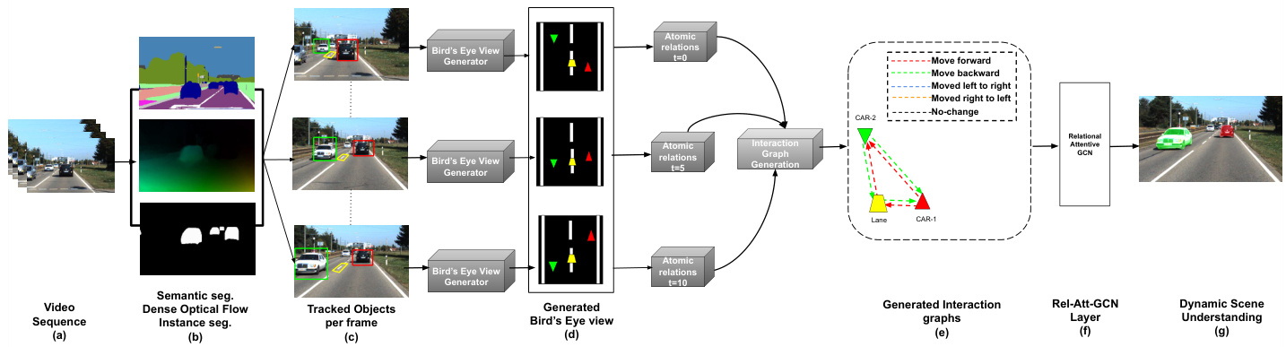Dynamic scene understanding requires well modeling of the different Spatio-temporal relations that may exist between various active objects in a scene. Towards this goal, we propose a pipeline that first computes a time-based ordered set of spatial relations for each object in the video scene. Secondly, it generates a multi-relational interaction graph representing the temporal evolution of the spatial relations between entities obtained from the previous step. Finally, it leverages a graph-based behavior learning model to predict behaviors of vehicles in the scene. Fig 2 provides an overview of our proposed framework.