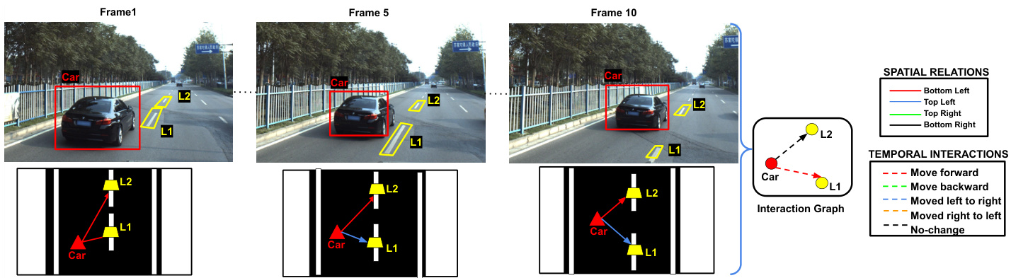 在此,我们对物体和智能体进行建模,为方便起见,通常将它们统称为物体,特指主动车辆时则称为智能体。理解场景中所有物体对之间空间关系的演变对分析其行为至关重要。为此,我们提出了一种交互图 (Interaction graph),将场景中的不同智能体和物体建模为节点。该图通过带有关系演变标注的双向非对称边(见图1(c)),捕捉场景中所有物体对之间的时空关系演化。